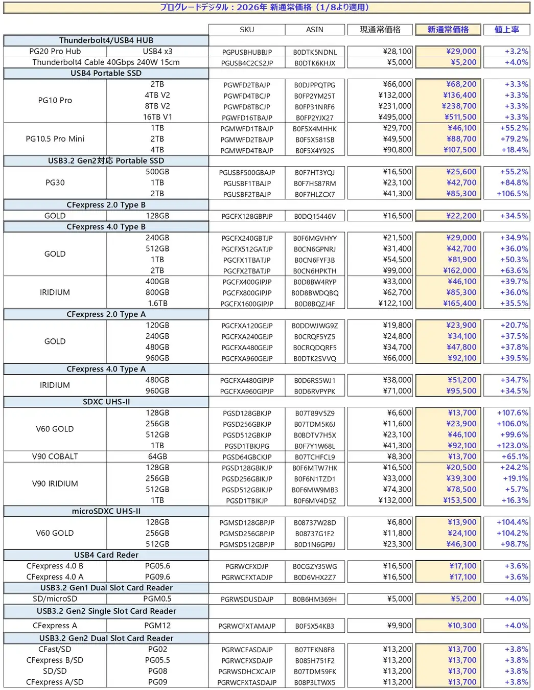 ProGrade will have a significant price increase for memory cards in Japan on January 8th, “due to the surge in demand associated with the construction of AI infrastructure.” The ProGrade SDXC UHS-II V60 GOLD 1TB memory card, for example, will go up by 123% – here is the full list of price increases: