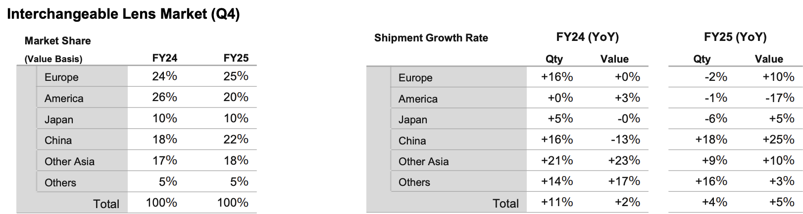 - DSLR lenses (2025 full-year market snapshot): -31% units / -36% value