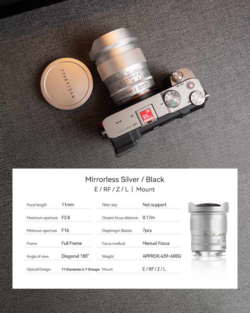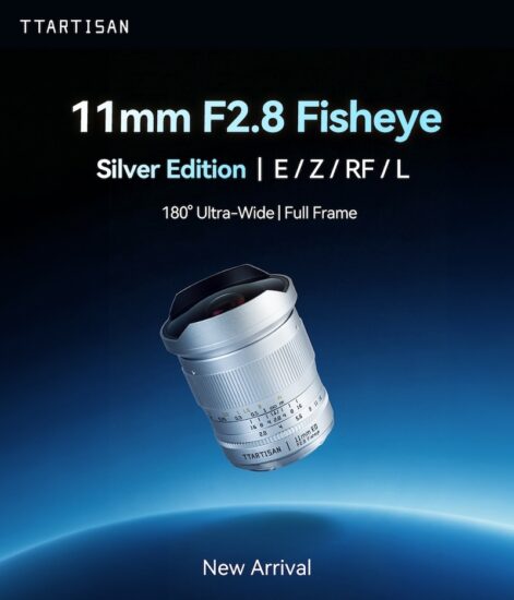 The TTartisan 11mm f/2.8 fisheye full-frame lens (E/Z/RF/L) is now also available in silver