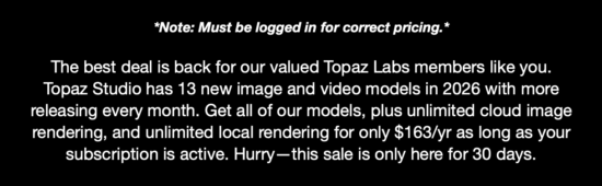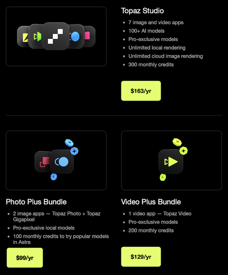| Topaz Studio (Includes all 7 apps, 100+ AI models, and 300 monthly credits) | $163/yr |