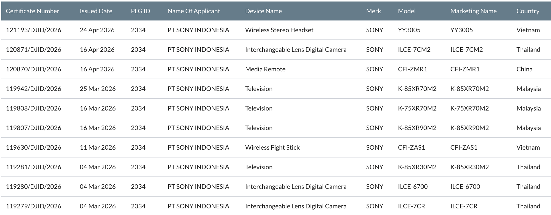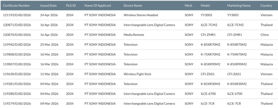 Here are the latest Sony registrations at the Indonesian certification authority: