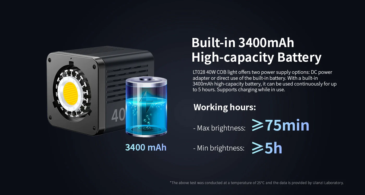 The Ulanzi 40W LED Light is a dual-color temperature light boasting a compact, portable design with a built-in battery that delivers a remarkable 70 minutes of continuous use. This unique feature sets the product apart in the market and addresses the problem of power supply for outdoor shooting that many photographers encounter.