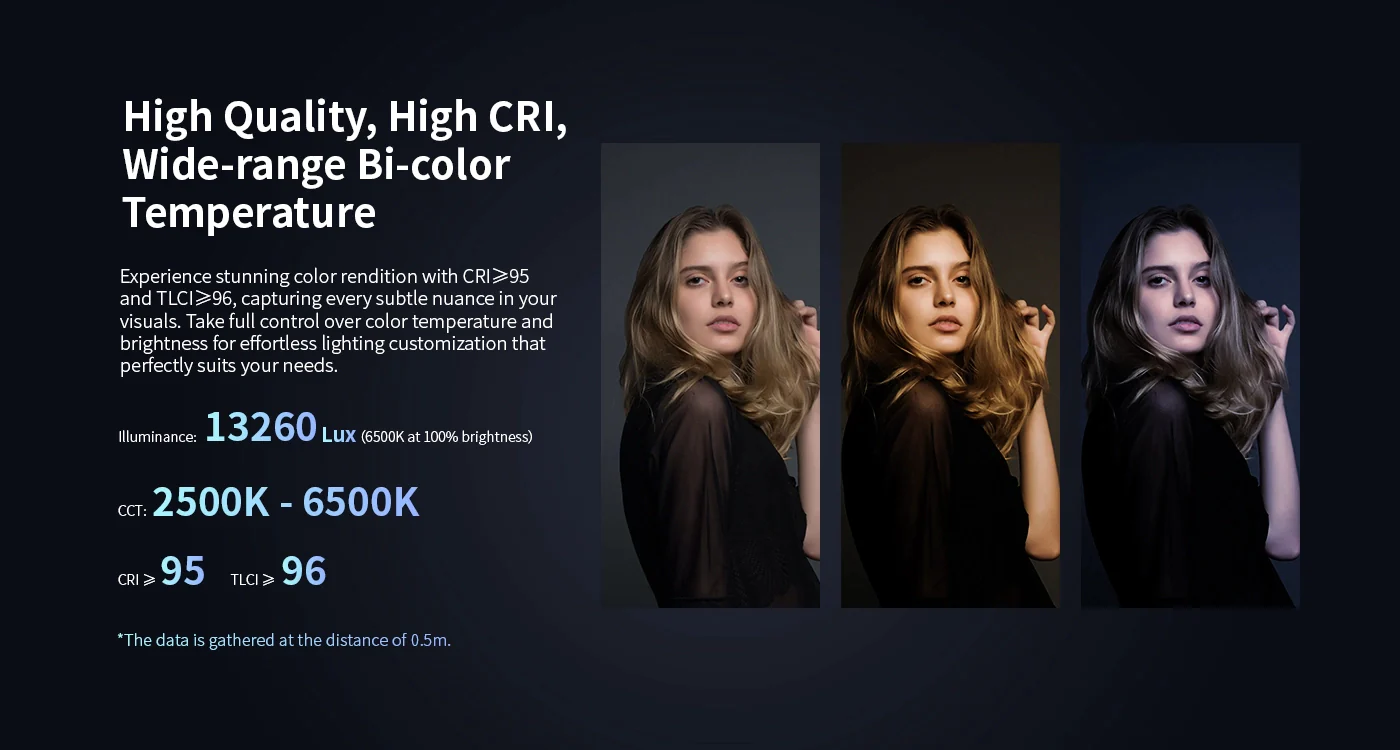 - Illuminance In 6500K/100% Brightness (0.5m): 13260Lux (With standard hood)