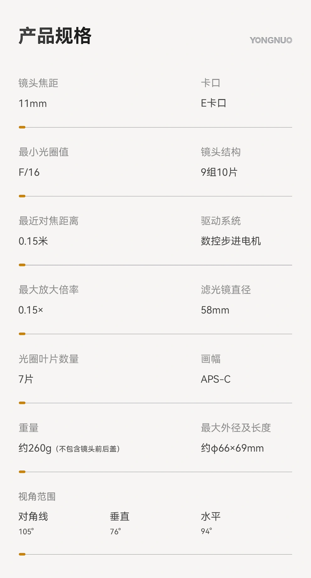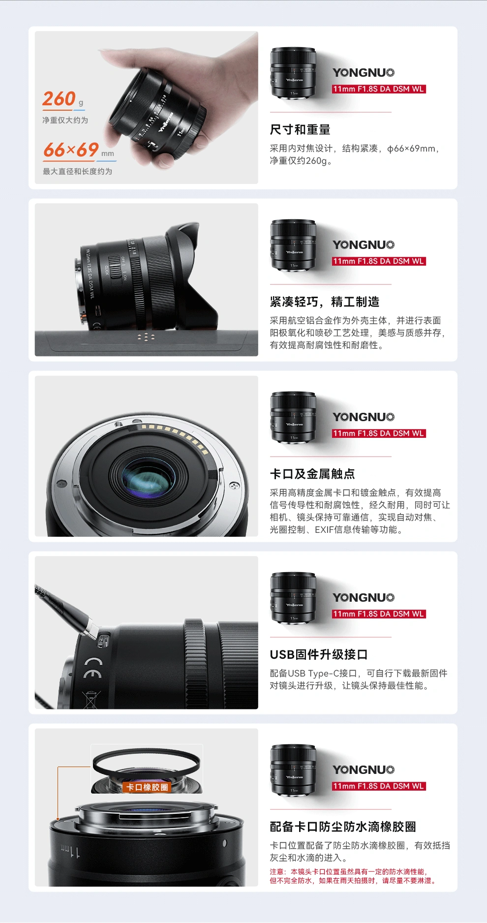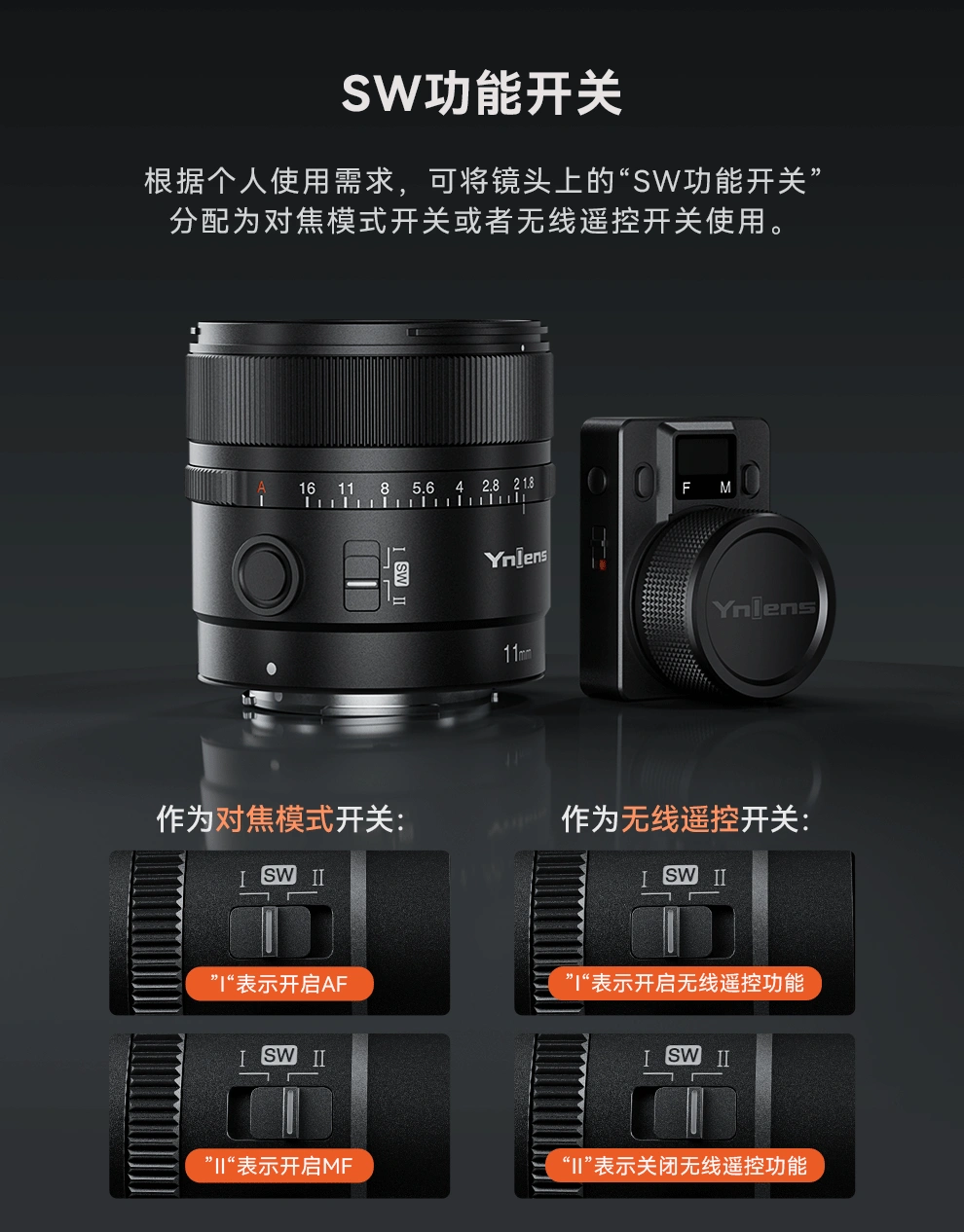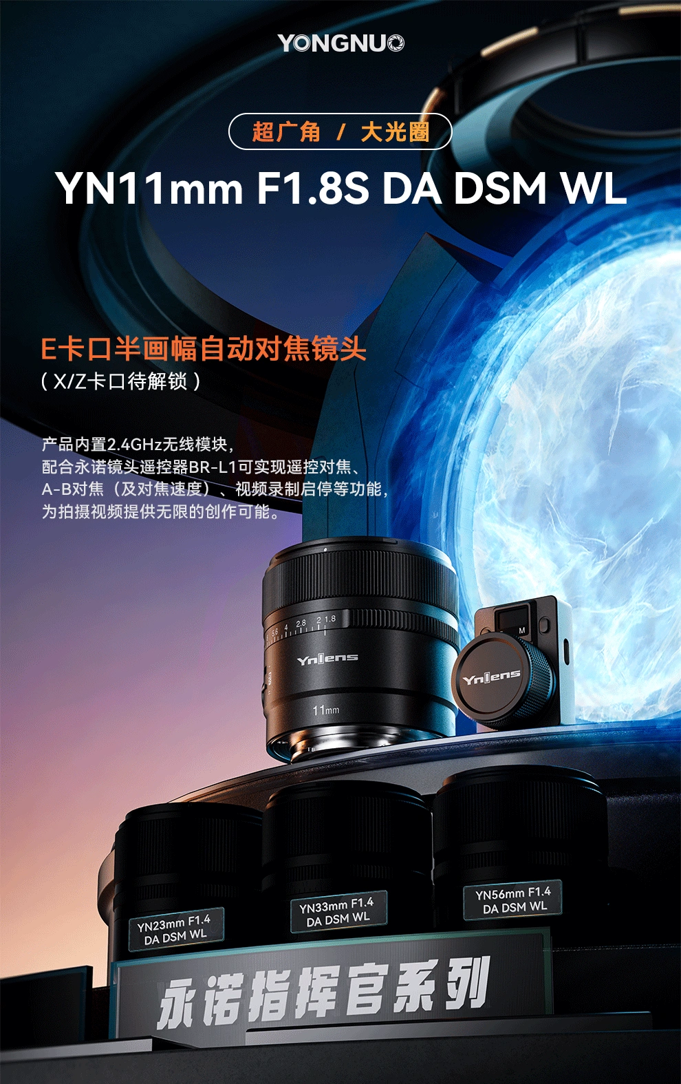 The previously reported Yongnuo YN 11mm f/1.8S DA DSM WL APS-C ultra-wide angle autofocus lens is now officially announced in China for Sony E mount (other mounts, including Nikon Z, will be released later). The new lens has a unique feature: remote wireless focusing using the optional remote control operating at 2.4 GHz. The lens will soon be listed for sale in the US at the Yongnuo Amazon store. Additional information: