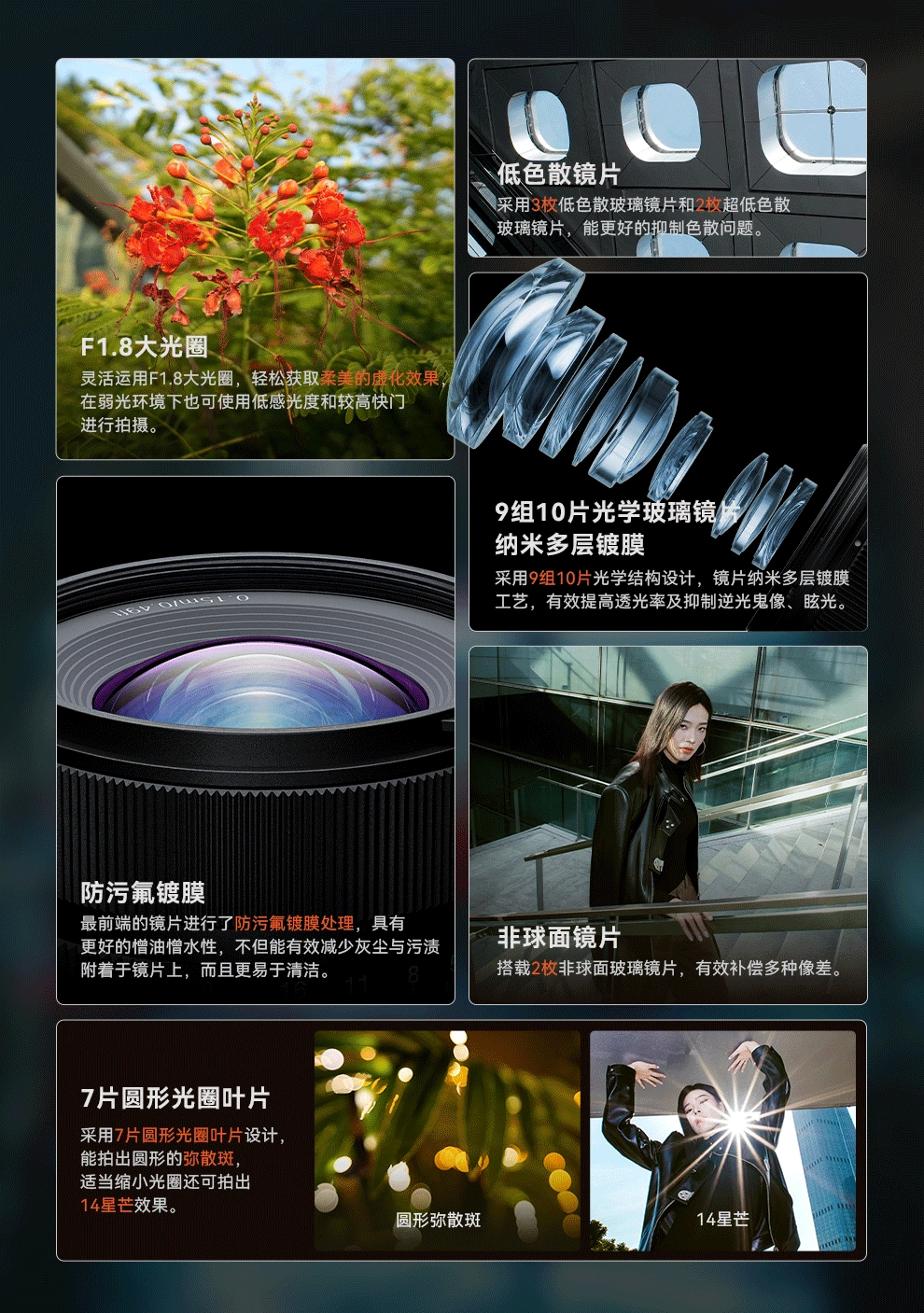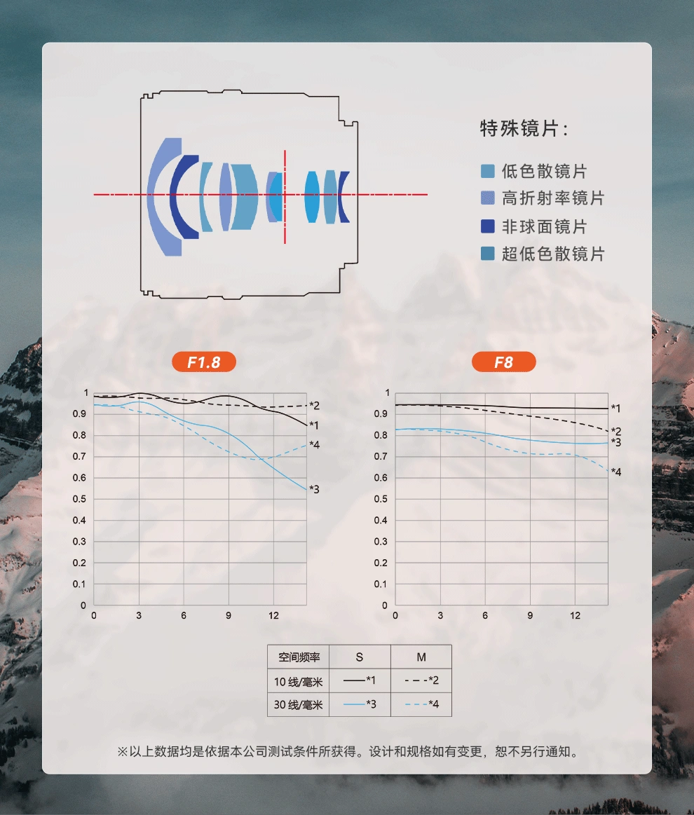 - Configuration: 10 elements in 9 groups, including 3 low dispersion elements, 2 extra-low dispersion lenses, 3 high refractive index lenses, and 2 aspherical lenses