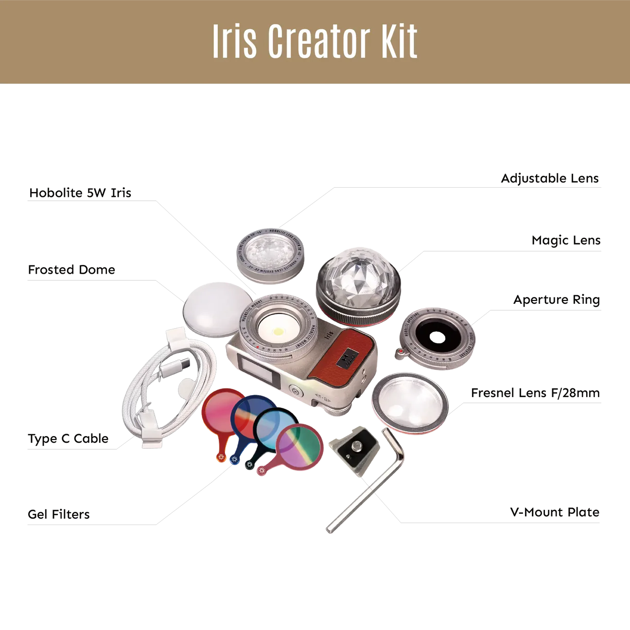 The Iris Creator Kit comprises all the elements featured in the Standard Kit, and features an Aperture Ring, Gel Filters, Magic Lens, Fresnel Lens f/28mm, Adjustable Lens and Frosted Dome.