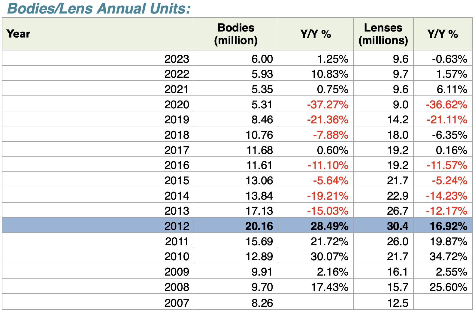 CIPA has predicted 5.89m ILCs, 1.52m compacts and 9.57m lenses for calendar 2024. Based on 2023 shipping patterns, ILC’s could conceivably come in at 6.1-6.5m units. (That’s higher at the low end than we predicted last month). That compares to: