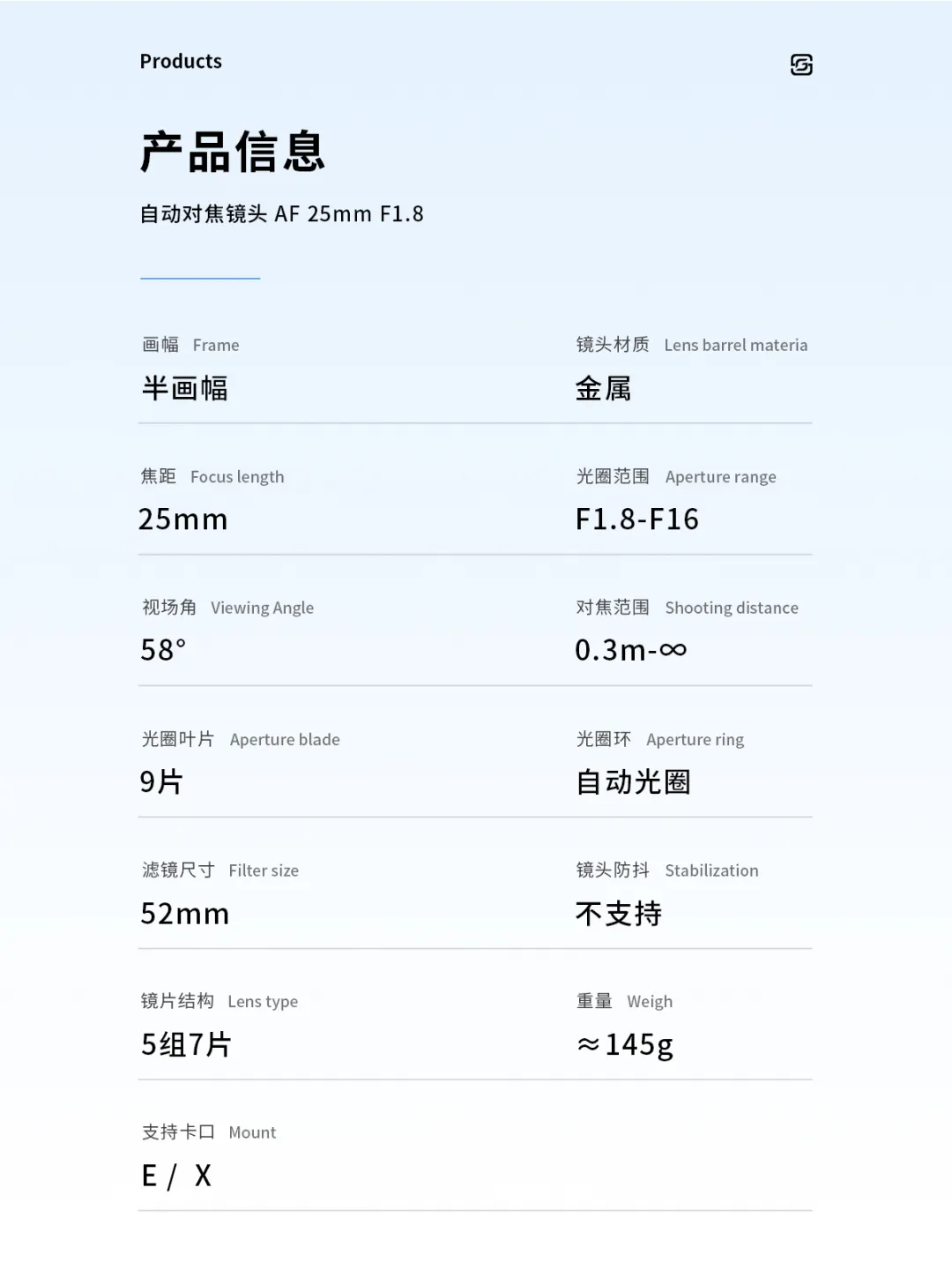 - Focal length: 25mm (35mm format equivalent: 37.5mm)