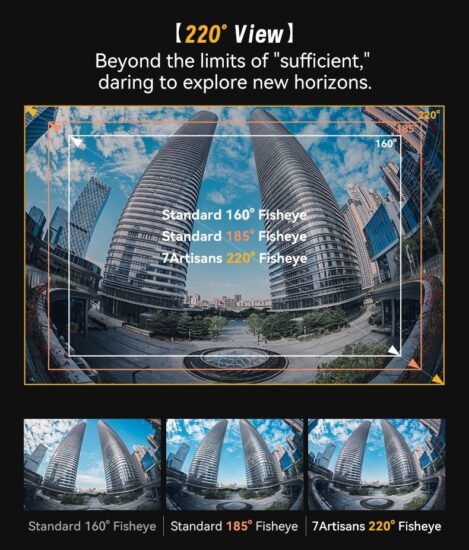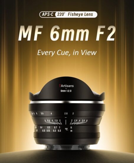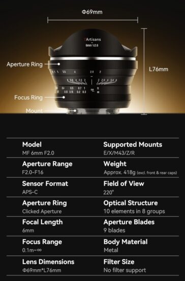 The previously reported 7Artisans MF 6mm f/2 220° APS-C fisheye lens (E/X/Z/R/MFT) is now officially announced: