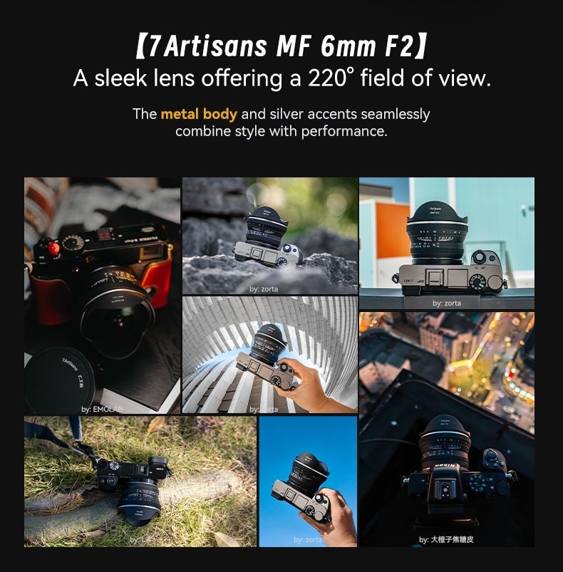 The previously reported 7Artisans MF 6mm f/2 220° APS-C fisheye lens (E/X/Z/R/MFT) is now officially announced: