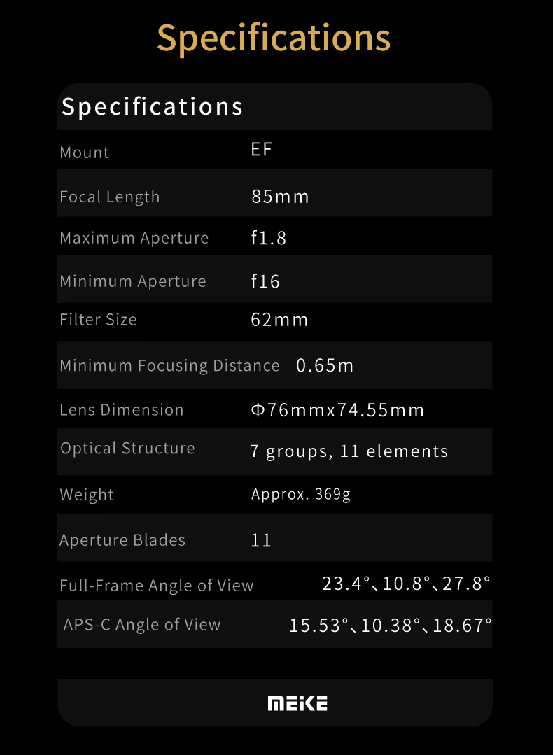 The previously rumored Meike AF 85mm f/1.8 SE Mark II lens for EF/F/Z/E mount is now officially announced: