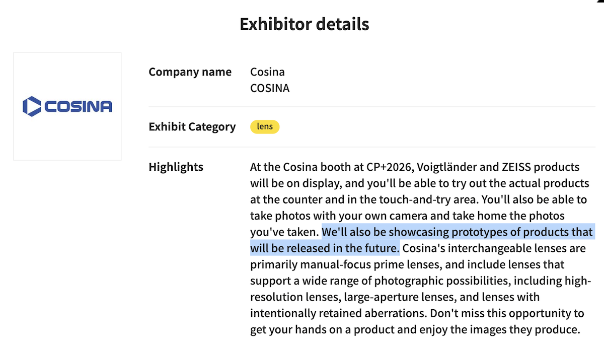 Cosina will display new lens prototypes at the 2026 CP+ show in Japan: