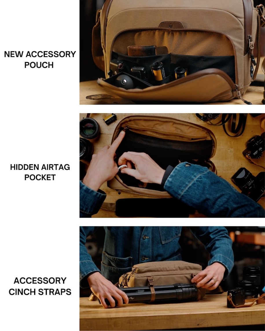 The new Camera Sling v2.0 is the next iteration of the bag originally launched for photographers who wanted to carry light, move freely, and keep their camera close at all times. The new v2.0 retains the same compact 6L size, but with refined details based on real-world use and photographer feedback over the past couple of years. Updates include improved internal organization, an external accessory pouch, bottom cinch straps for extra carry, a hidden AirTag pocket, and a longer, pivoting shoulder strap.