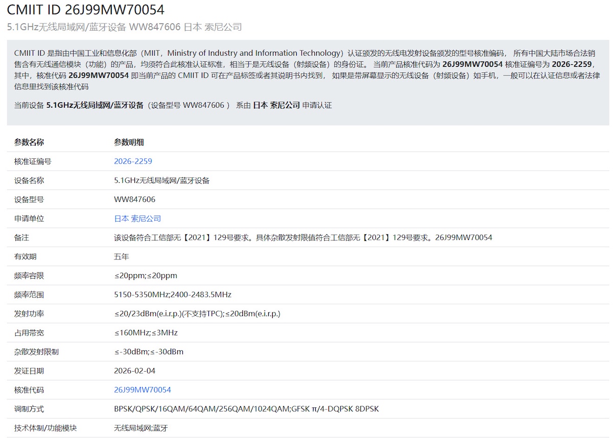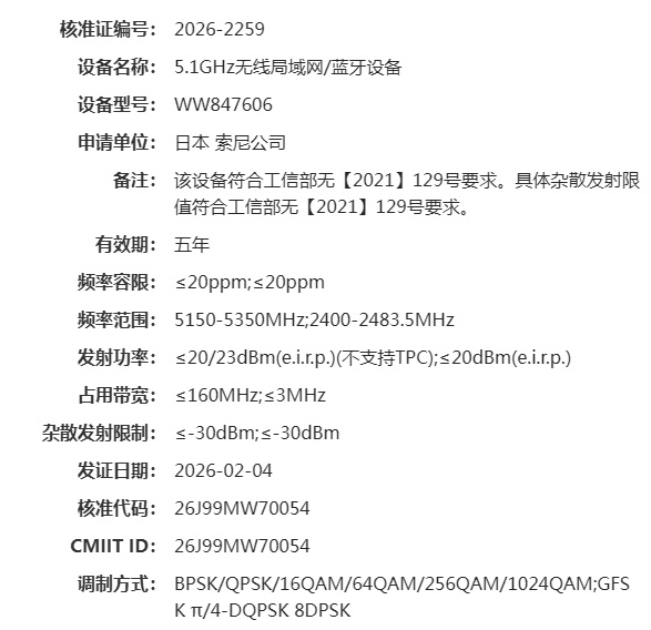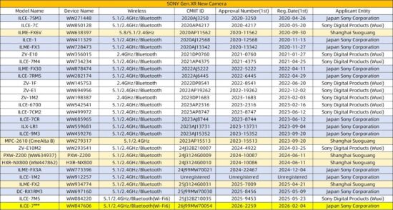 Sony registered a new WW847606 camera overseas – maybe it is the rumored Sony a7R VI or the Sony FX8? The new model supports a 160MHz bandwidth, it uses the WiFi 6 BIONZ XR2 processor, and it will be made in Japan: