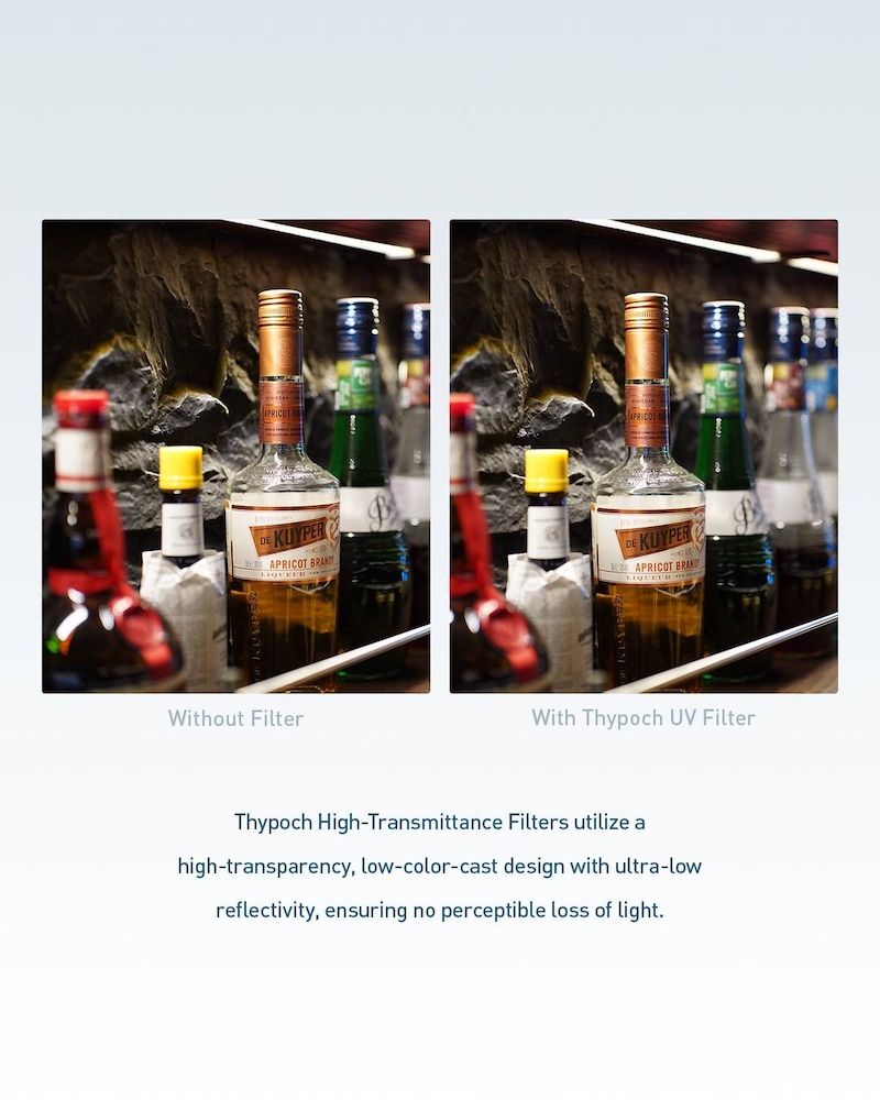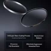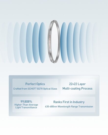 Engineered with premium SCHOTT B270 optical glass and precision ground & polished, the TP filter is coated with 22+22 layers of multi-directional nano-coating. Boasting class-leading high transmittance in the 430–680nm visible light spectrum, it delivers zero sharpness loss, zero color shift, zero flare and ghosting, with high light transmission and low reflection. Experience near bare-lens shooting performance that fully unlocks your lens’ native optical potential.
