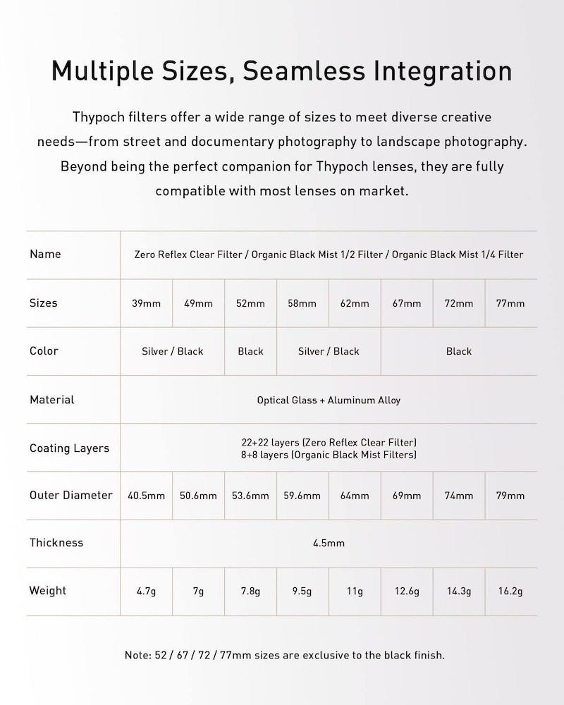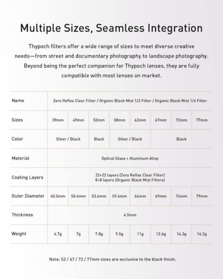 The previously reported new Thypoch Zero Reflex filters are now officially announced, featuring 0.01% ultra-low reflectivity with 1/4- and 1/2-strength, and available in 39mm | 49mm | 52mm | 58mm | 62mm | 67mm | 72mm | 77mm sizes: