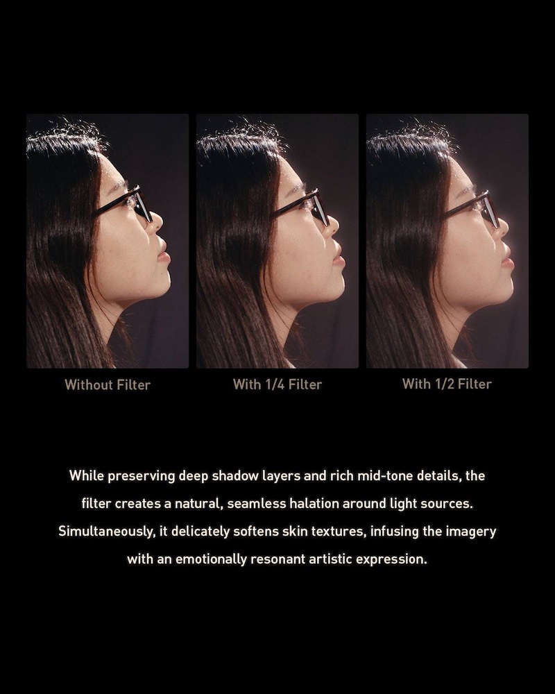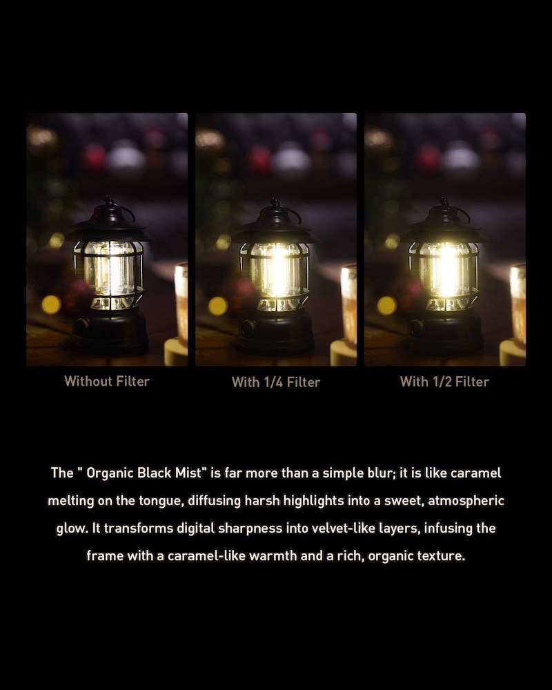 This black mist filter softens harsh light and highlight edges, creating a natural, film-like gradation texture. It gently blurs skin blemishes and fine lines without distorting skin tones, resulting in softer, more pleasing visuals. Available in multiple filter thread sizes for universal lens compatibility.